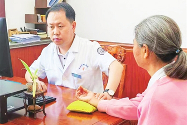 图为:申秉瑞为患者把脉